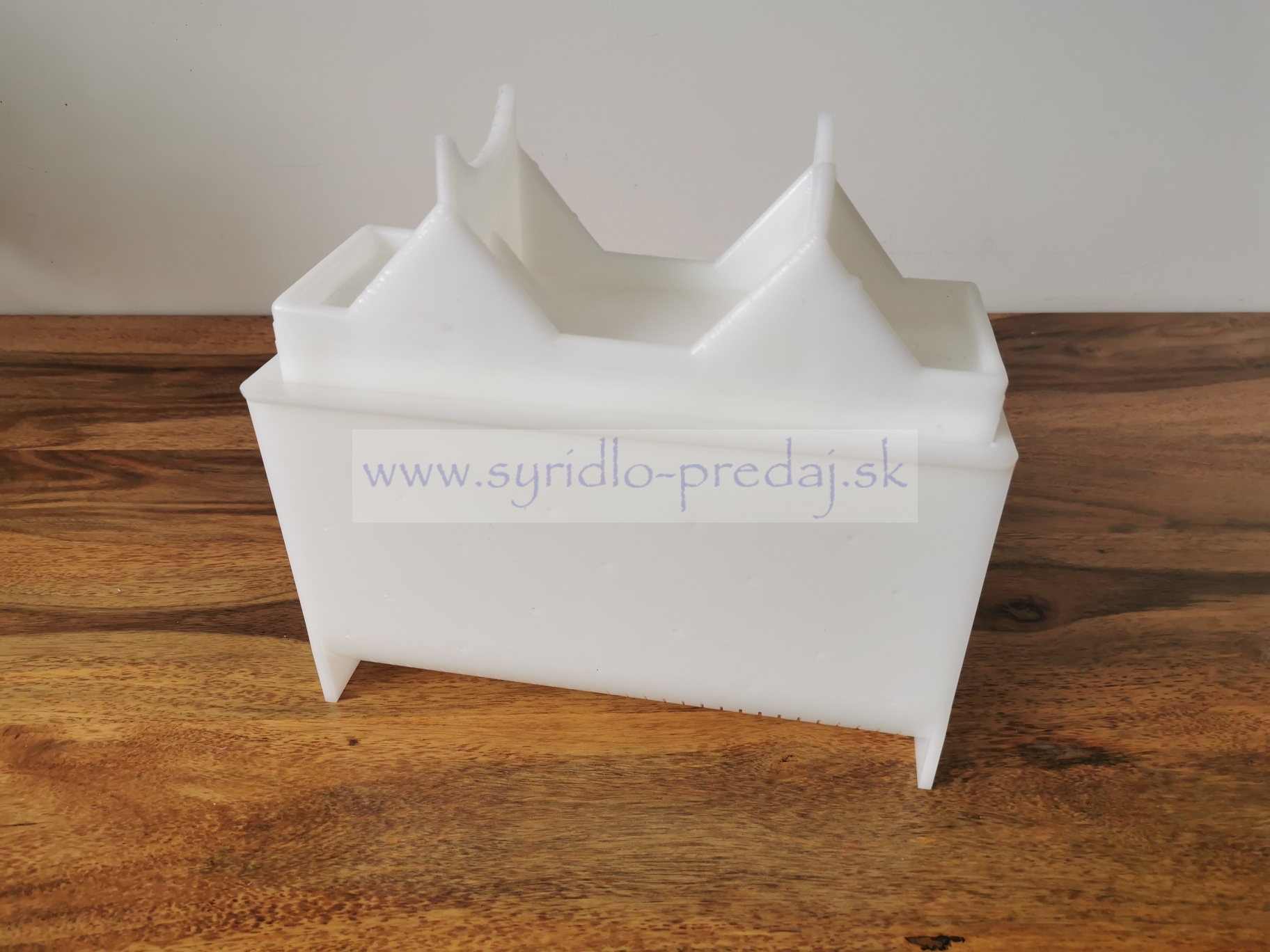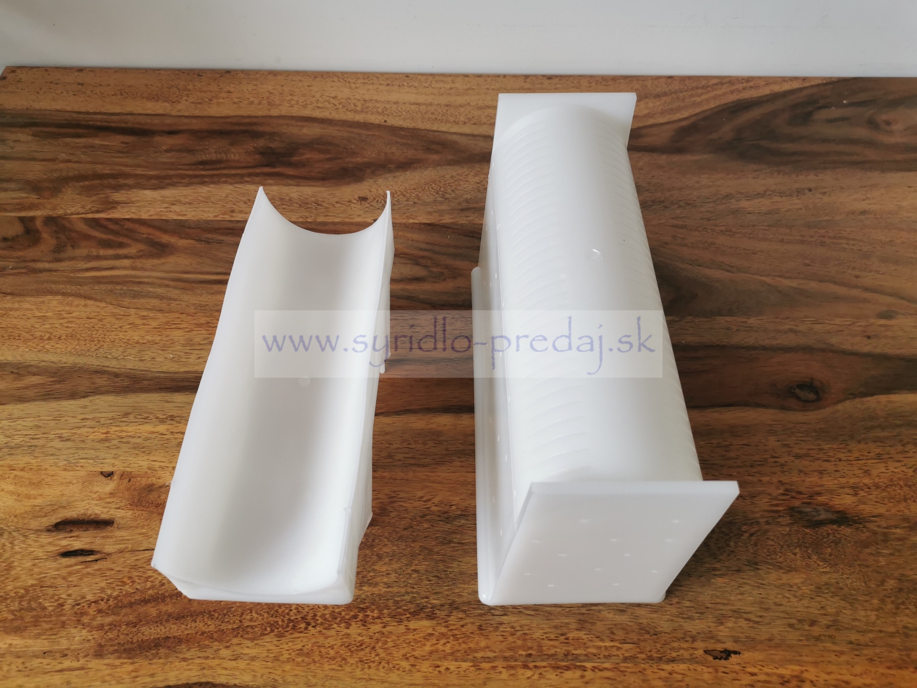 Odtokové otvory na spodnej časti formy účinne slúžia na oddelenie srvátky v procese tvarovania syra. Forma je vyrobená z pevného plastu.